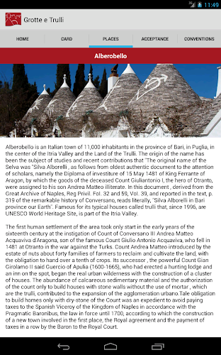 Analýza A Revize Aplikací Pro Android: Grotte e Trulli, Vyvinuté Společností NeaLogic. Uvedeno V Kategorii Cestování A Místní Informace. Aktuální Verze Je 1.1, Aktualizována Na 08/06/2018 . Podle Recenzí Uživatelů Na Google Play: Grotte e Trulli. Dosaženo Více Než 824 Instalací. Grotte e Trulli Má V Současné Době Recenze 7, Průměrné Hodnocení 4.4 Hvězd