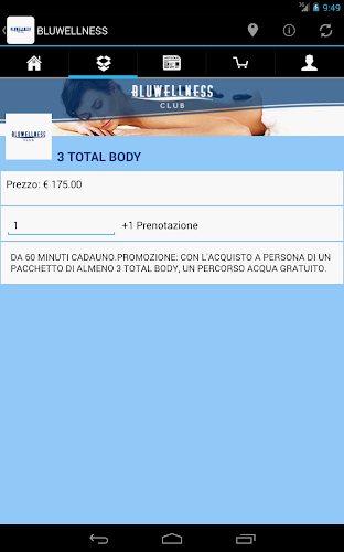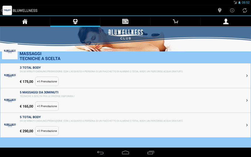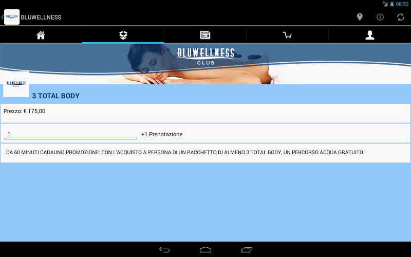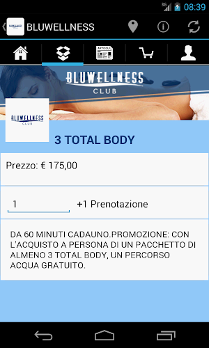 download our app Bluwellness, to have a virtual piggy bank with an initial credit of EUR 10,00 available right now that allows you to accumulate quickly and easily loyalty points and discounts.every 10.00 euro purchased treatments will have 1.00 euro to spend on more trattamenti.bluwellness is a modern wellness hotel located in Montesilvano, in the province of Pescara, in a position to offer relaxing and slimming treatments for him and her