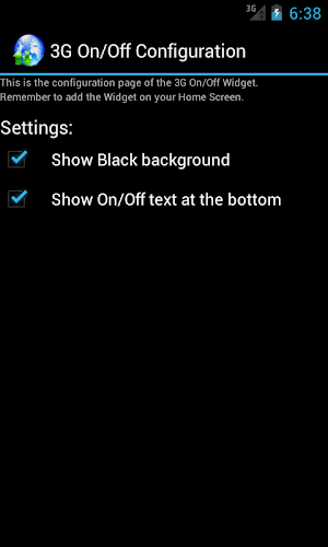 Tento widget vám pomůže při zapnutí a vypnutí 3G.Funguje i na Android 4 (restart zařízení je nutné, aby ukázal widget v seznamu).