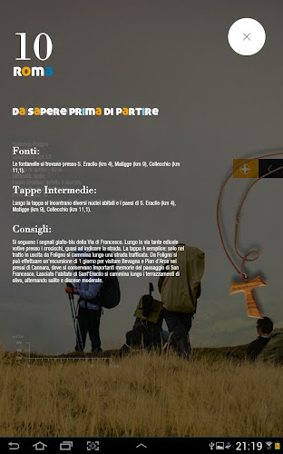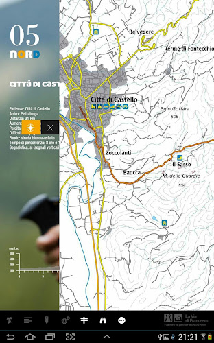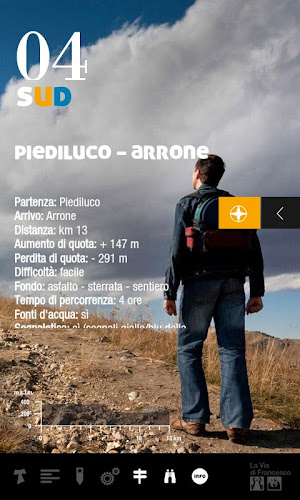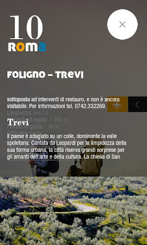 - Každá fáze je doprovázena: Technická list, TEXTUAL ROADE, ADCES THE STRUES THE STRACE STAWES THE STRACE. Použití reality Augmented, která umožňuje reprezentaci změněné reality, ve které jsou virtuální informace překrývány na normální vnímané realitě a můžete se rozhlédnout pomocí kamery vašeho iPadu/iPhone, objevit Umbrianské trasy a získat informace.
