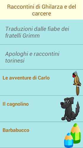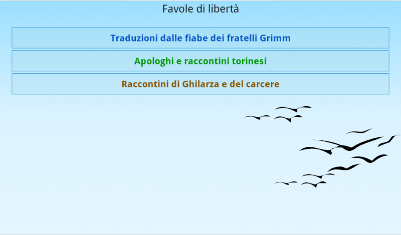 „bajky o svobodě“, které obsahují překlady antonio gramsci, aby zdokonalil svou němčinu, vytvořil pro děti z pohádek bratří Grimmů. kniha také obsahuje „bajky a příběhy z Turína“ a „příběhy o ghilarze a vězení“,...