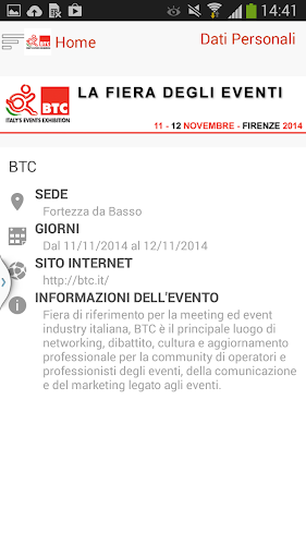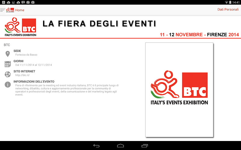 Celý veletrh události v aplikaci: Prozkoumejte program BTC 2014, prohlédněte vystavovatele a najdete všechny užitečné informace, které se na akci zúčastní. Sledujte nás na sociálních sítích s hashtagem#BTC2014.Referenční spravedlivý pro italské průmysl setkání a událostí je BTC hlavním místem vytváření sítí, debaty, kultury a profesionální aktualizace pro komunitu operátorů a profesionálů událostí, komunikace a marketingu spojených s událostmi.