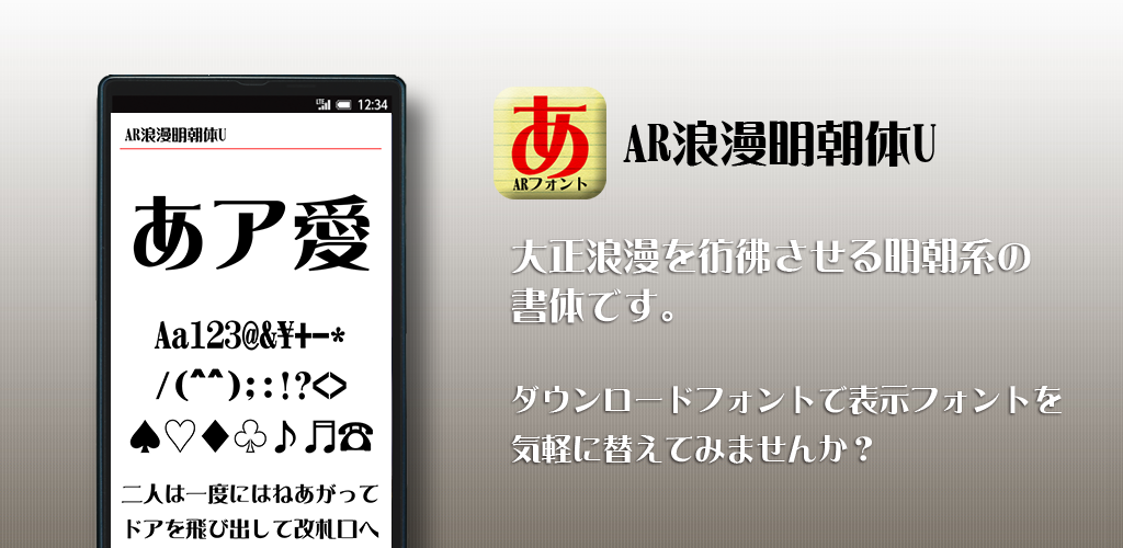 "AR Romance Mincho Tu U" je písmo Mincho připomínající Taisho Romance. Unikátní expresivní písmo je atraktivní.