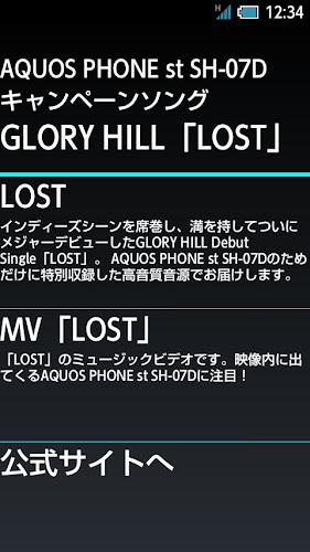 AQUOS je PHONE st SH-07D kampaň píseň GLORY HILL hudbu a widgety MV je vidět hlavní debutový singl "prohrané".Tato aplikace nelze přehrávat na jiných modelech, protože to je jen SH-07D.