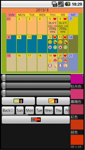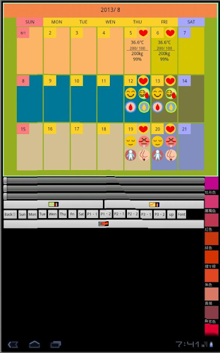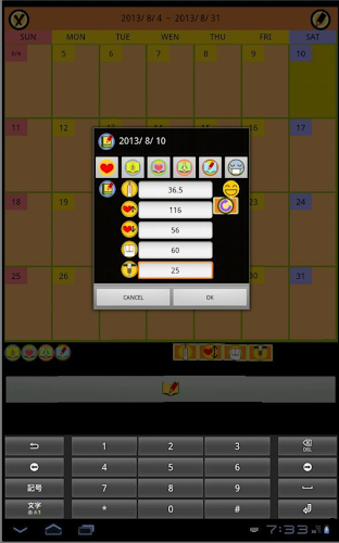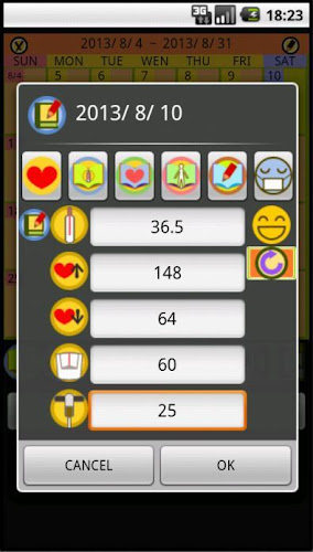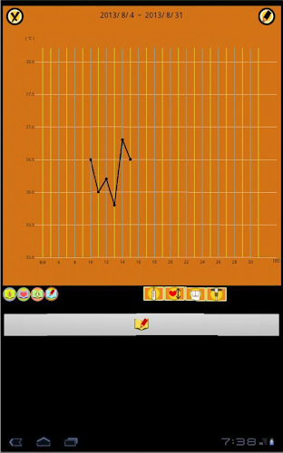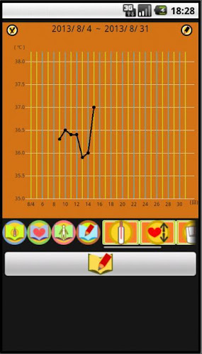 byla vytvořena tabulka bazální tělesné teploty.záznam je tělesná teplota, krevní tlak, tělesná hmotnost, procento tělesného tuku, fyzická kondice, nálada, menstruační krev, textil, spánkový edém, napětí na hrudi.