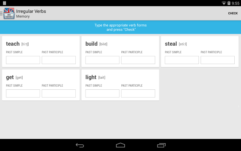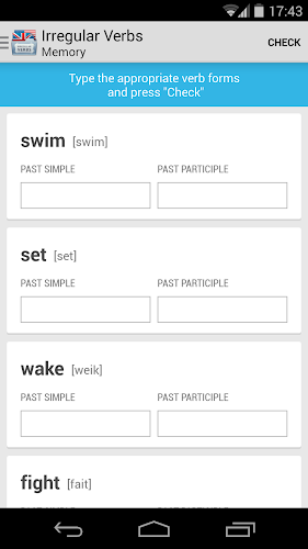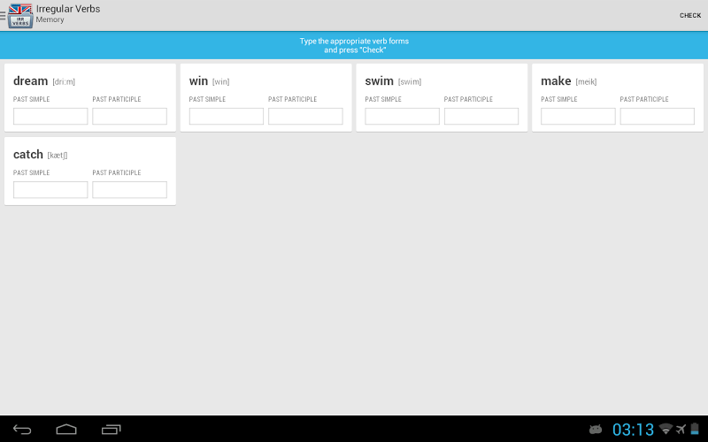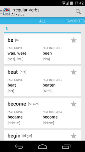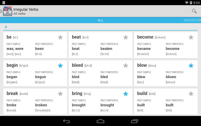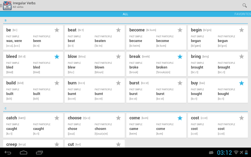 Analýza A Revize Aplikací Pro Android: Irregular Verbs (EN/US), Vyvinuté Společností JQ Soft. Uvedeno V Kategorii Vzdělávání. Aktuální Verze Je 1.0.2, Aktualizována Na 11/05/2014 . Podle Recenzí Uživatelů Na Google Play: Irregular Verbs (EN/US). Dosaženo Více Než 10 Tisíc Instalací. Irregular Verbs (EN/US) Má V Současné Době Recenze 782, Průměrné Hodnocení 4.1 Hvězd