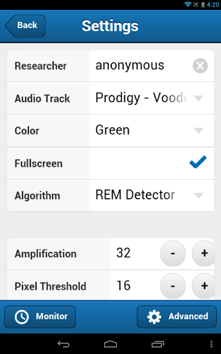 Lucid Scribe je monitor výkonu pro sebe. Navrženo pro detekci pohybů očí během spánku. Lze jej nakonfigurovat pro přehrávání zvukových stop, když je detekován jakýkoli pohyb nebo když jsou během snu detekovány rychlé vzorce pohybu očí: Elektrookulografie (EOG).algoritmus detekce Rem je experimentální. Bude to jasně fungovat pouze během odpoledního zdřímnutí nebo s nočním světlem. Může být testován blikání šestkrát v řadě, se dvěma sekundy mezi každým mrknutím. Musíte být úplně klidně. Cílem je umístit telefon na noční stolek s kamerou směřující k posteli. Pak ležte na vaší straně směrem k nočnímu stolku.