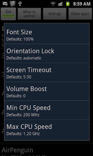 PerApp umožňuje přizpůsobit své zařízení s per-aplikací individuálních nastavení.V současné době můžete měnit následující nastavení pro jednotlivé aplikace: