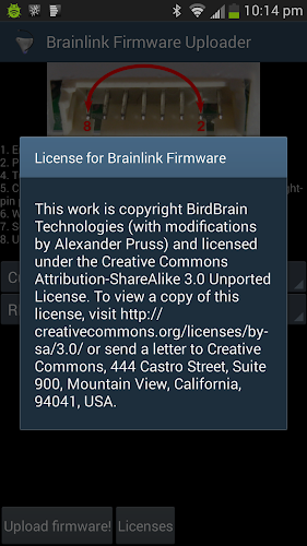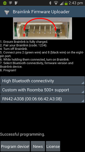 To je snadný-k-použití neoficiální uploader pro některé neoficiální firmware pro zařízení Brainlink. Neoficiální firmwary umožňují Brainlink fungovat jako serial-to-Bluetooth spojení průchozí, se speciálními optimalizací pro Roomba a Mindflex zařízení. S vlastní firmware, Brainlink může fungovat jako běžný Roomba-to-Bluetooth spojení, kompatibilní s mnoha Roomba dálkové ovládání aplikace (jen se ujistěte, vybrat firmware v závislosti na modelu Roomba máte). Tyto firmwary jsou navrženy tak, aby byly zpětně kompatibilní s firmwarem Brainlink OEM, který je také součástí, takže můžete downgrade zpět.Můžete také vyladit nastavení připojení k Bluetooth modulu uvnitř Brainlink. Vyšší nastavení usnadňují připojení zařízení k Brainlink, ale používají životnost baterie.