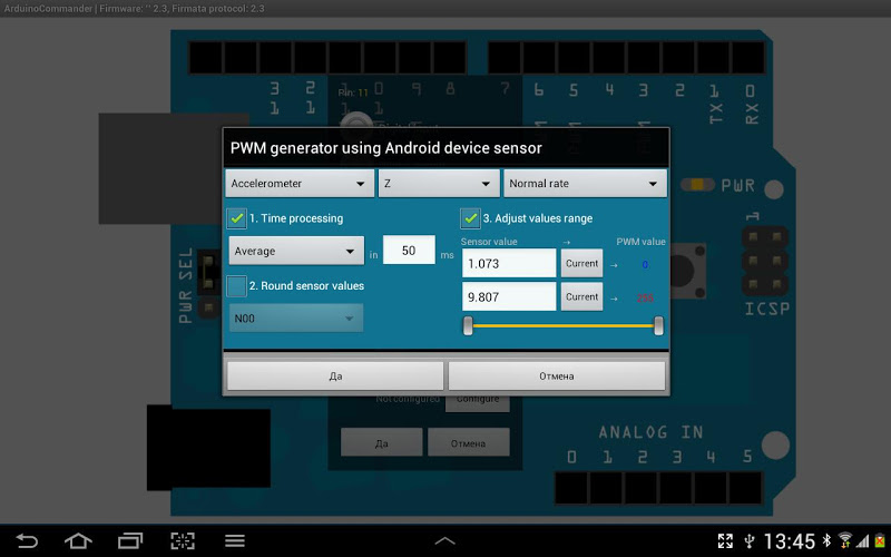 - Arduino senzory (set pwm výstup pomocí Sensors Android Device Sensors (Accelerometer, Gyroscope, ...))