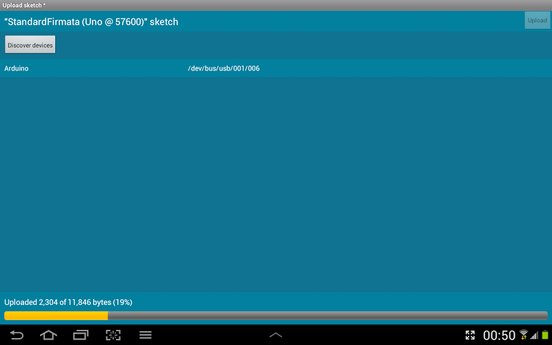 Upload StandardFirmata Sketch do vaší desky Arduino First (nabídka/upload skicte */standardní firmata @ 57600)