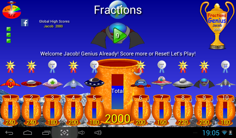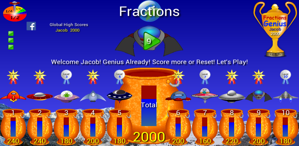 -získejte 1000+ celkové skóre, abyste se stali expertem na zlomky, 1500+ pro mistra zlomků a 2000+ a získejte trofej génia zlomků.