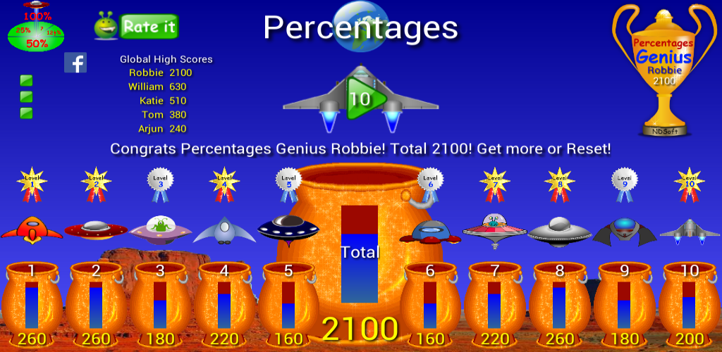 -získejte 1000+ celkové skóre, abyste se stali expertem na procenta, 1500+ jako procentuální mistr a 2000+ a získejte procentuální trofej génia.