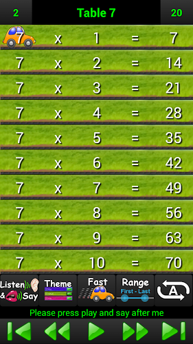 vyberte rozsah stolů, které se chcete naučit .. a řekněte . nech „mluvící stoly“ řeknou řádek tabulky a vy řeknete po něm.