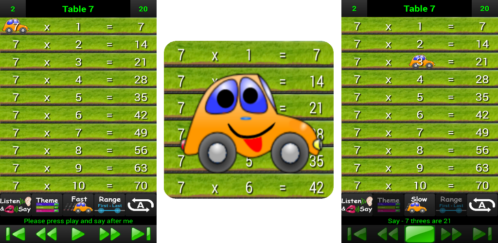 vyberte rozsah stolů, které se chcete naučit, a řekněte . nech 'mluvící stoly' řeknou řádek tabulky a ty řekni po něm.