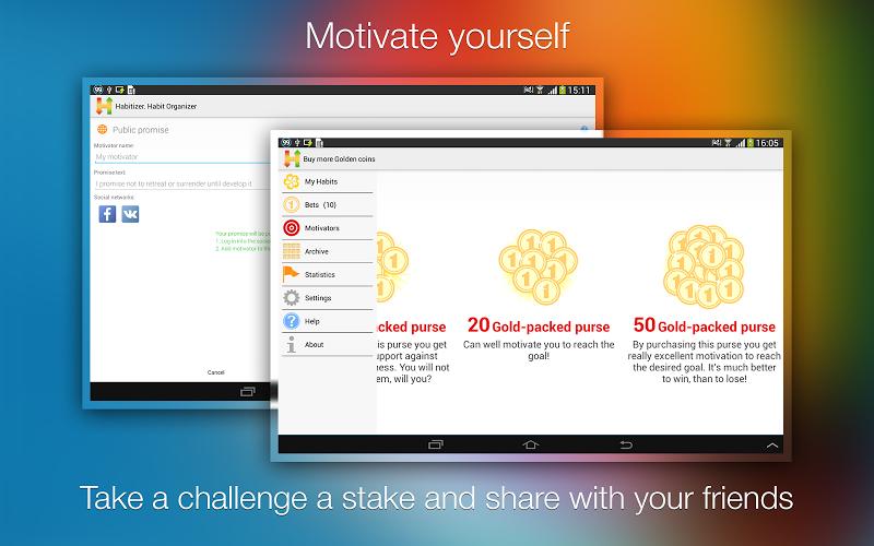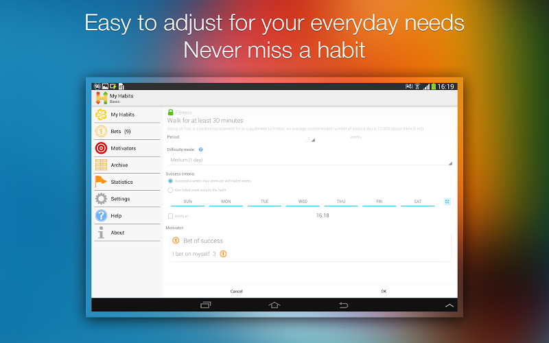 Habizer je aplikace, která vám pomůže budovat nové zdravé návyky a začít udržovat zdravý životní styl. Je to pohodlný a efektivní nástroj, který vám pomůže nahradit špatné návyky a rizika dokonalou fyzickou zdatností, zdravou stravou a vysokou kvalitou života. liber tisíckrát, ale vaše přání se nikdy nesplnila? Váš problém je to, co nejčastěji stojí na cestě ke zdravému životnímu stylu: Nemůžete změnit svůj život, dokud se nedostanete do řady zdravých návyků. Nemáte žádné stopy, jak to udělat? Aplikace Habizer umožňuje dostat se do zdravých návyků jednoduchých a snadných. Každopádně je to všechno na vás. Není třeba přizpůsobit své cíle poskytnutým šablonám. Vyberte si čas a podmínky, jak získat zvyk. Habizer vám opakovaně připomene cílový cíl, sleduje váš pokrok a zaznamená všechny své milníky na cestě k úspěchu. Stačí se podívat na svůj smartphone, abyste si byli vědomi vašeho aktuálního stavu. A co víc, můžete sdílet zprávy o svém úspěchu se svými přáteli v sociální síti. #}Habizer je perfektní nástroj, který vám pomůže při získávání zdravých návyků a následně žít zdravým životním stylem. Splňte své sny, udělejte klíčový krok na cestě do zdravého života!