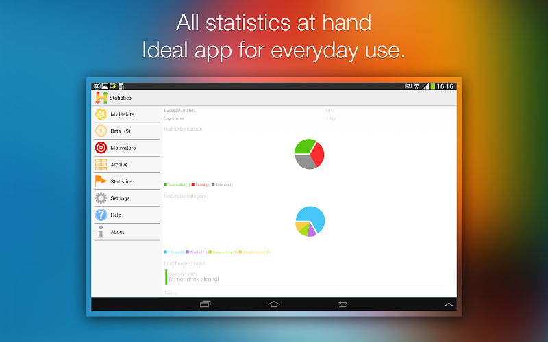 Analýza A Revize Aplikací Pro Android: Habitizer. Habit Organizer, Vyvinuté Společností Applied Systems Ltd.. Uvedeno V Kategorii Produktivita. Aktuální Verze Je 1.4.1, Aktualizována Na 29/07/2015 . Podle Recenzí Uživatelů Na Google Play: Habitizer. Habit Organizer. Dosaženo Více Než 10 Tisíc Instalací. Habitizer. Habit Organizer Má V Současné Době Recenze 584, Průměrné Hodnocení 4.2 Hvězd