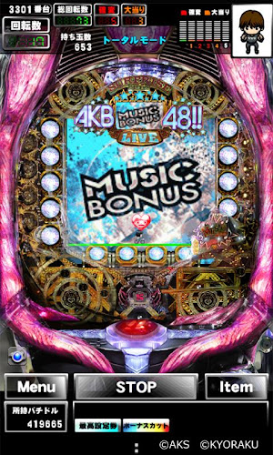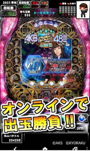 „Pachinko AKB48“ je hlavní postavou národně populárního idolu, AKB48, a je velmi populárním modelem, který byl představen v roce 2012. Má božskou specifikaci 50% a míru pokračování asi 72% !!Jackpoty v "Music Rush !!" jsou asi 2 000 míčků, takže v závislosti na vývoji můžete vydělat velké množství koulí v jednom zásahu.