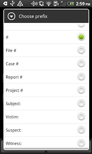2. Footer of Photos obsahuje možnost pro (a) přidat text zarovnaný vlevo z rozbalovací nabídky s předpony #, File #, Case #, Report #, předmět, oběť, podezřelý a svědek; a (b) uživatelé, aby vložili svůj vlastní pravoúhlý identifikační alfanumerický text.