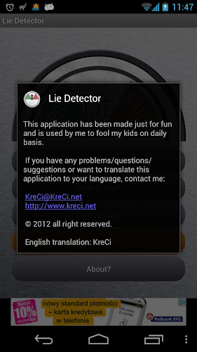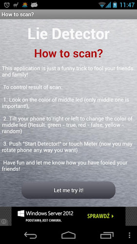Analýza A Revize Aplikací Pro Android: Lie Detector Prank, Vyvinuté Společností KreCi.net. Uvedeno V Kategorii Zábava. Aktuální Verze Je 1.4, Aktualizována Na 28/02/2017 . Podle Recenzí Uživatelů Na Google Play: Lie Detector Prank. Dosaženo Více Než 500 Tisíc Instalací. Lie Detector Prank Má V Současné Době Recenze 2 Tisíc, Průměrné Hodnocení 3.3 Hvězd