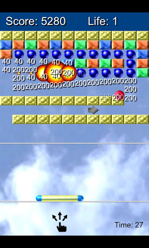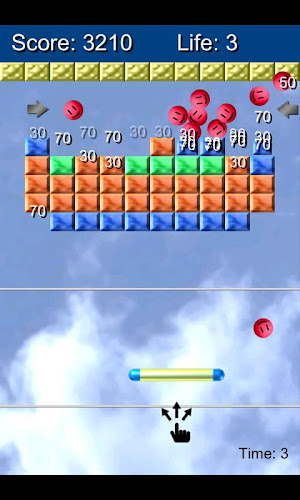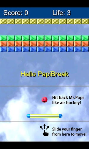 Toto je směs klasické blokovací hry a vzdušného hokeje.Posuňte prst na obrazovku a ovládejte pádlo. Snímkem Red Ball (Mr.Papi) stiskněte zpět s pálem a rozbijte všechny bloky. Pokud narazíte na míč rychleji s pádlem, míč se pohybuje rychleji.
