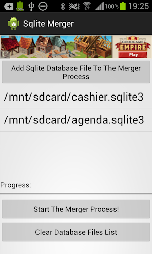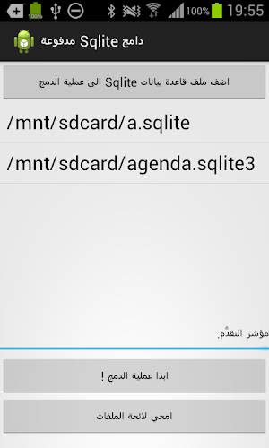 Android aplikace napsané v Javě. Je možné sloučit několik souborů databáze SQLite, do jediné SQLite databáze souborů.Definice Pohledy a indexy a spustí se pak zkopírovány do textového souboru umístěného vedle nového databázového souboru, kde je výstup sloučení stalo.