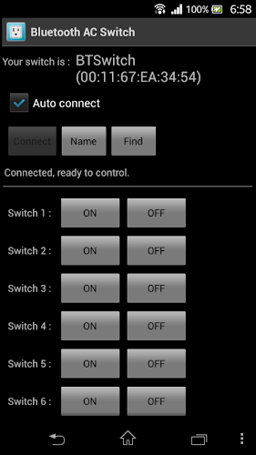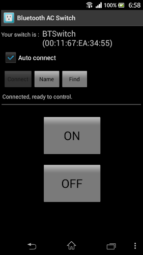 zapněte nebo vypněte síťový vypínač z mobilního telefonu. tato aplikace je navržena pro práci s bluetooth ac přepínačem, hardwarem také od unisvr.