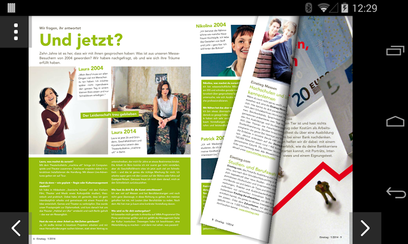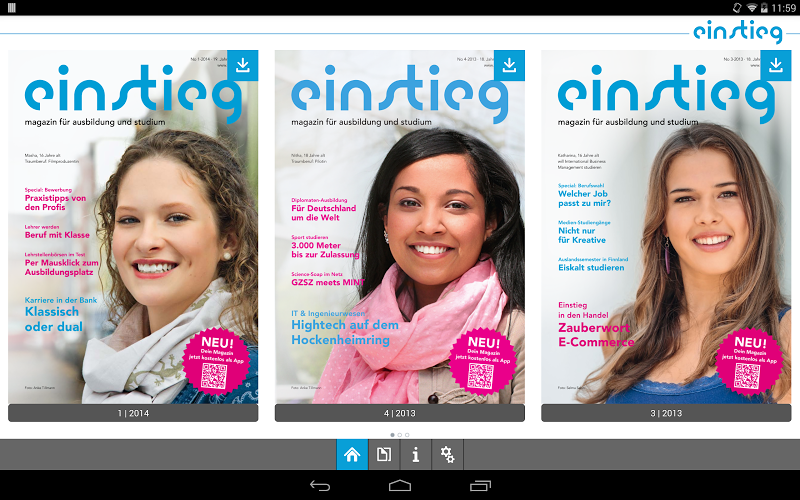 Das Einstieg Magazin ist die Zeitschrift für Ausbildung und Studium in Deutschland. Es informiert über Studiengänge und Ausbildungsangebote, porträtiert Hochschulen und Unternehmen, stellt Wege ins Ausland vor und gibt Bewerbungstipps. Kurzum: Einstieg beantwortet alle Fragen, die nach dem Schulabschluss anstehen. Seit 1997 vertrauen Lehrer auf die inhaltliche Qualität und bestellen das vier Mal im Jahr erscheinende Heft für ihre Schüler.Diese App bringt das Einstieg Magazin kostenlos als E-Paper aufs Smartphone oder Tablet. Sie enthält die jeweils aktuelle und ein Archiv älterer Ausgaben. User können die Ausgaben entweder herunterladen und anschließend offline lesen oder direkt online schmökern. Für die App werden die Inhalte der Print-Ausgabe digital ergänzt, zum Beispiel durch Videos und weiterführende Links.