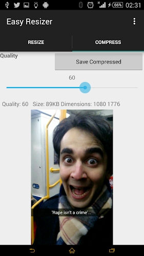 Všimněte si, že většina obrázků na Android je ve formátu PNG a velmi těžká. S jednoduchou kompresí mohou být změněny od 3 MB do 500 kB nebo méně. (velikosti se liší v závislosti na obrázku). Obrázky komprimované touto aplikací budou uloženy ve formátu JPEG.