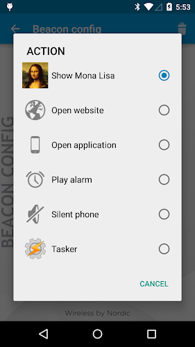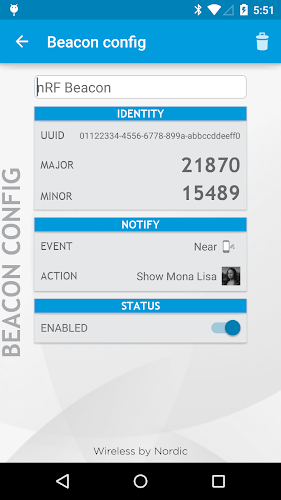 Aplikace NRF Beacon vám umožňuje prozkoumat celou řadu možností pro majáky pomocí technologie Bluetooth Smart Technology. Aplikace byla navržena tak, aby demonstrovala všechny vlastnosti soupravy Bluetooth® Smart Beacon NRF8122. Funguje to částečně také s majáky od jiných výrobců. V současné době maják může ztichnout telefon, otevřít aplikaci, otevřít web v prohlížeči, ukázat předdefinované informace o objektu (malba Mona Lisa) nebo hrát alarm na jedné ze 4 událostí: oblast majáku byla zadána nebo vystoupena, a Beacon je blízko nebo velmi blízko.na Android 4.3 a 4.4.x Aplikace vyžaduje, aby byla na zařízení nainstalována aplikace NRF Beacon Service. Lze jej stáhnout z Google Play: https://play.google.com/store/apps/details?id=no.Nordidemi.android.Beacon.service.{#AYSINCE Android 5 (Lollipop) aplikace a používá nativní API. Aplikace NRF Beacon Service může být odstraněna z telefonu. , Nexus 5, Nexus 7 s Android 4.4.2, 4.4.4 a 5.