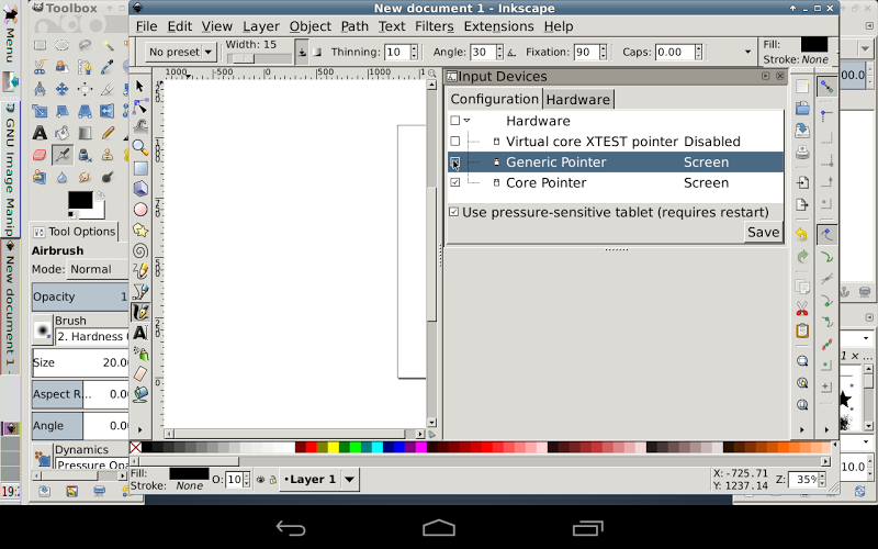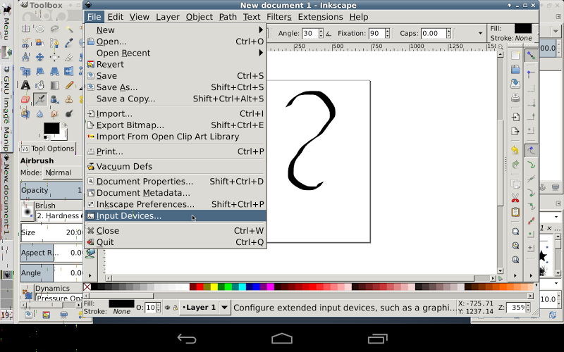 Tato aplikace již není aktualizována, alespoň ne, dokud nedostanu nový telefon.dva grafické editory, přenesené z PC. Chcete -li je použít, budete potřebovat myši, stylus nebo 10 ”obrazovku. je pokročilý editor obrázků, vhodný pro takové úkoly, jako je retušování fotografií, složení obrázků a autorizace obrázků. } Oba podporují tlak stylusu. V Inkscape budete muset povolit Android dotykový displej v souboru → vstupní zařízení (viz snímky obrazovky).