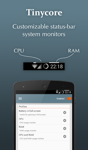 Vyzkoušejte naši novou hru Pixie Dust: http://goo.gl/xjhygz; indikátor CPU nebo RAM. Indikátor je několik vysokých linek pixelů, který je ve výchozím nastavení přidán do pravého horního rohu status-bar. a je zcela navržen tak, aby byl lehký (nízká systémová stopa). S monitorováním TinyCore se vaše zařízení CPU nebo RAM stává mnohem jednodušší a zajímavější. Unlocked pomocí nákupu in-App.Typy monitoru: