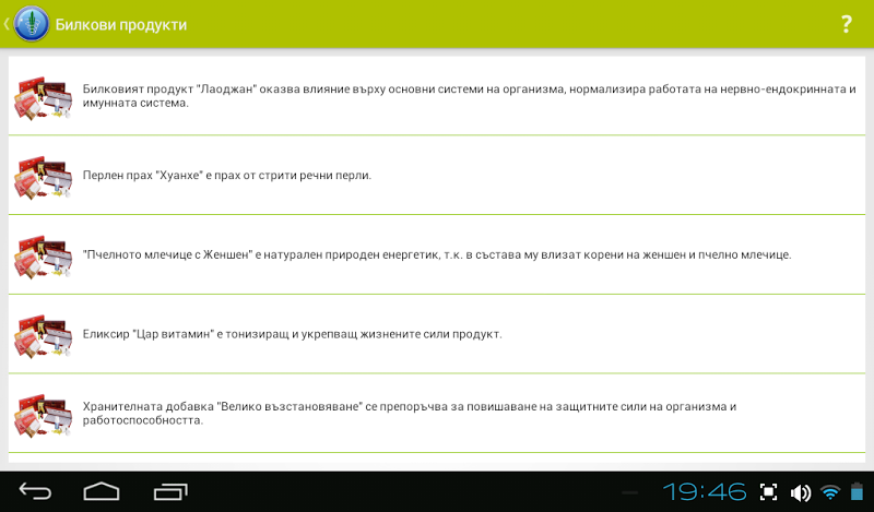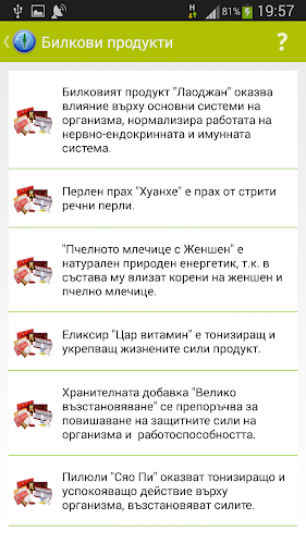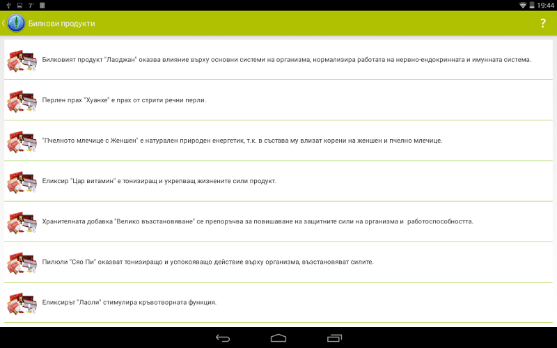 Bylinné výrobky tradiční čínské medicíny jsou prezentovány v několika klíčových oblastech:- Bylinné přípravky na posílení imuniteta- bylinné trávicí systém- antilovní produkty bylinné produkty Kravoobrashtenie- bylinné produkty pro linii genitourinárního systému- lékařská a ochucenásveshti- bylina Produkty pro aktivní sportuvashti-- bylinné výrobky pro ústní kuhina- kosmetiku- Jiný přírodní bylinkový produktivav každý nabízený bylinkový produkt obsahuje pouze přírodní PAC