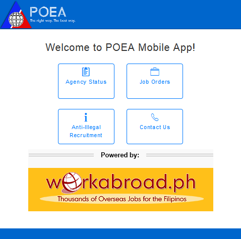 Poea Mobile je nástroj pro nábor anti-ilegal, který lze použít k ověření licenční platnosti agentury náboru k náboru a nasazení Filipínců pro zaměstnání v zahraničí. Mobilní aplikaci Poea lze také použít ke kontrole, zda úloha inzerovaná náborovými agenturami již má objednávky na zaměstnání. }Funkce: