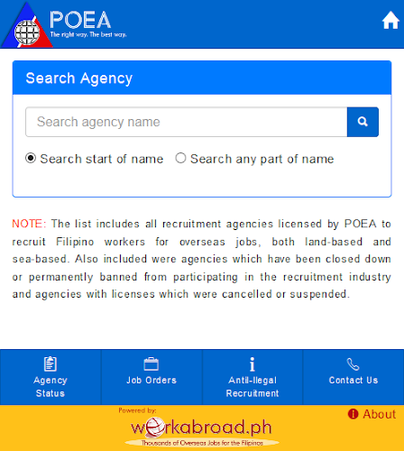 Search PoeA-Accredited Philippine agentury a jejich aktuální stav.