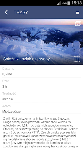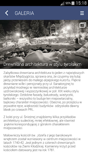 Mobilní aplikace "Villa Rose - Międzygórze" byla vytvořena pro lidi, kteří navštíví jednu z nejkrásnějších oblastí Klodzko Valley. Hlavní menu aplikace vás provede po okolních turistických atrakcí a zájezdy Międzygórze. Zde můžeme nalézt roztříděné objekty, které stojí za návštěvu, a trasy, které byste měli jít. Aplikace také představuje tematické fotogalerie Międzygórze a okolních oblastí. Dalším velmi důležitým prvkem, který se zaměřuje na prezentaci aplikace je Villa Rose - nejdůležitější informace o penzionu, kontaktní informace, prezentačních místností a nachází se ve svých zařízeních pro hosty.Klíčové vlastnosti: