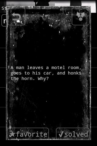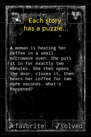 Příběhy získaly v popularitě v posledních letech. V angličtině jsou většinou známí stejně jako tajemné hádanky, ale v němčině se také nazývají laterální myšlení, tajemství, hádanky nebo černé příběhy.Příběhy jsou zvláštním druhem hádanek, které jsou navrženy tak, aby byly interaktivní. Jsou zábavné pro jízdy automobilů nebo jiné příležitosti. Obvykle se hrají ve skupině, přičemž jedna osoba hostuje hádanku a ostatní kladou otázky, na které lze odpovědět pouze odpovědí „ano“ nebo „ne“. V závislosti na nastavení a úrovni obtížnosti mohou být další odpovědi, rady nebo jednoduché vysvětlení, proč je odpověď ano nebo ne, považovat se za přijatelné. Puzzle je vyřešena, když jeden z hráčů dokáže recitovat vyprávění, které měl hostitel na mysli, zejména vysvětlující jakýkoli aspekt počátečního scénáře byl záhadný. Barman vytáhne zbraň, ukazuje na muže a napíchne ji. Muž říká „Děkuji“ a odejde. Co se stalo?