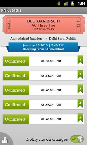 Enter your PNR # once in the app, the app will do the rest. Will let you know the current status, will preserve the PNR number for future status checks and will automatically push you the results periodically. All with Zero configuration. Moreover, you will get an alert with the Coach/Seat number once the chart is prepared. All in a beautiful, drool-worthy interface.V Současné Době Nabízíme Verzi 1.0.4. Toto Je Naše Nejnovější, Nejvíce Optimalizovaná Verze. Je Vhodný Pro Mnoho Různých Zařízení. Zdarma Ke Stažení Přímo Apk Z Obchodu Google Play Nebo Jiných Verzí, Které Hostujeme. Kromě Toho Si Můžete Stáhnout Bez Registrace A Bez Nutnosti Přihlášení.