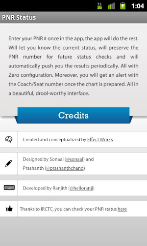 Enter your PNR # once in the app, the app will do the rest. Will let you know the current status, will preserve the PNR number for future status checks and will automatically push you the results periodically. All with Zero configuration. Moreover,...