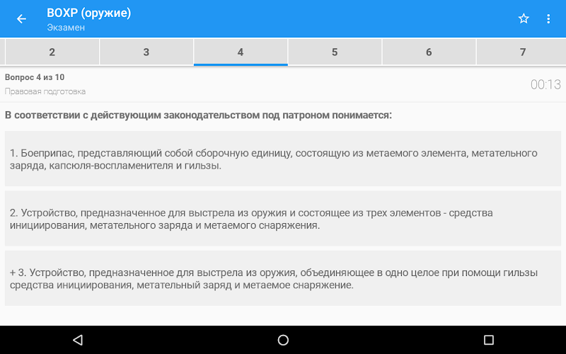 Версия без рекламыНазначение программы - подготовка работников ведомственной охраны, работников юридических лиц с особыми уставными задачами к тестированию и сдаче периодической проверки. Программа позволяет пройти тестирование по актуальному на данный момент списку из 244 вопросов. Также в приложении присутствуют вопросы для ведомственной охраны со спецсредствами (без оружия).