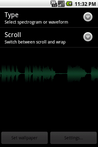 Živé tapety, které zobrazuje živé audio data jako spektrogram nebo křivky na domovské obrazovce. Pro další možnosti se také podívat naše od-verzi, která umožňuje měnit barvu, velikost, rychlost aktualizace a další.App se zobrazí v seznamu živých tapety (dlouhý kohoutek úvodní obrazovce)!