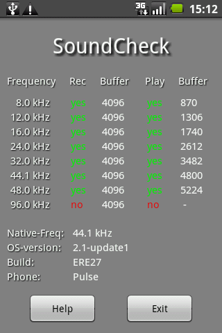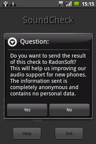 SoundCheck hodnotí funkce zvuku telefonu pro přehrávání a nahrávání. Pro vysoce kvalitní zvuk, by měly být podporovány 44,1 kHz nebo více.Výsledky mohou být volitelně zaslána na náš server, který nám umožní vytvořit veřejnou databázi schopností verze telefonu / os.