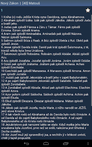 Česká svatá Bible. Aplikace je offline a nepotřebuje připojení k internetu. Doporučujeme používat připojení Wi-Fi. Historie - každé slovo, které jste kdy viděli, je uloženo v historii. Oblíbené - můžete přidat slova do seznamu oblíbených kliknutím na ikonu „Star“. Správa seznamů historie a favoritů - tyto seznamy můžete upravit nebo je vyčistit. Různá nastavení - můžete změnit písmo a téma aplikace (vyberte jedno z několika barevných témat). Slovo pravopis pomocí modulu textu na řeč (vyžaduje připojení k internetu). Poháněno ISPEECH®. Kontextové vyhledávání slov - klikněte na libovolné slovo v překladu a vyhledejte jeho překlad. Náhodné slovo dne. Chcete -li zobrazit widget v seznamu, musí být aplikace nainstalována do paměti telefonu (může být nainstalována databáze slovníku Anyware).