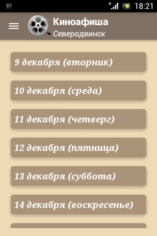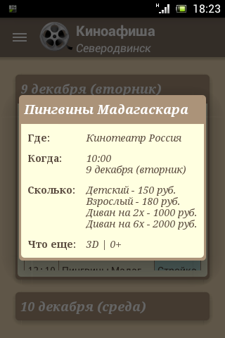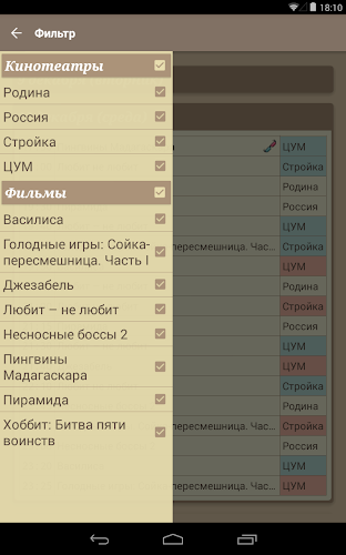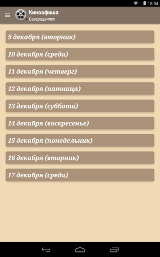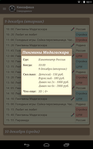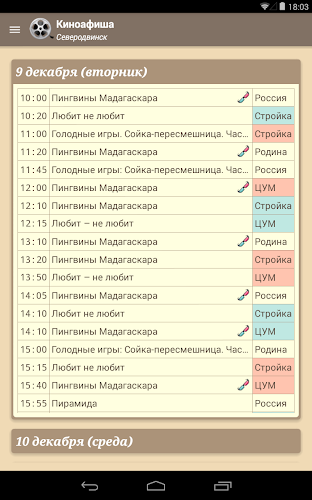 Приложение собирает расписания сеансов кинотеатров Северодвинска и показывает их в виде сводной таблицы. Результат можно фильтровать как по названию фильма, так и по названию кинотеатра. По долгому нажатию на элемент списка главного меню можно получить информацию о фильме или контакты кинотеатра.V Současné Době Nabízíme Verzi 1.3.4. Toto Je Naše Nejnovější, Nejvíce Optimalizovaná Verze. Je Vhodný Pro Mnoho Různých Zařízení. Zdarma Ke Stažení Přímo Apk Z Obchodu Google Play Nebo Jiných Verzí, Které Hostujeme. Kromě Toho Si Můžete Stáhnout Bez Registrace A Bez Nutnosti Přihlášení.