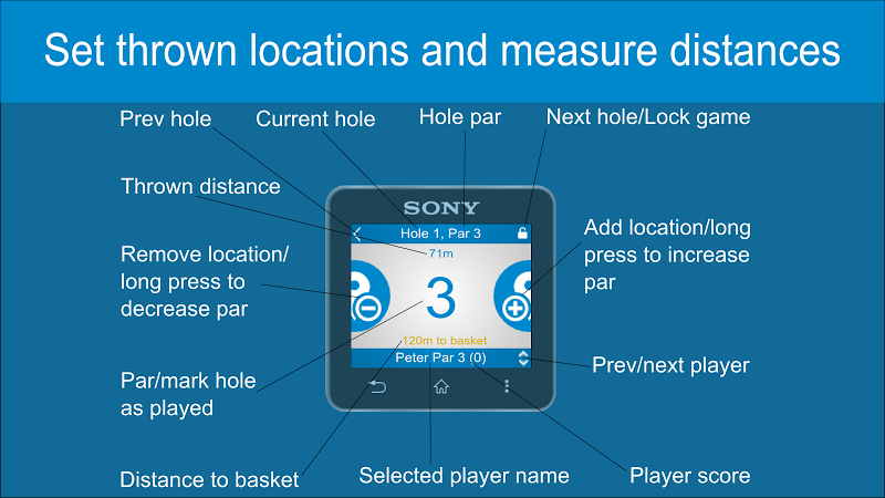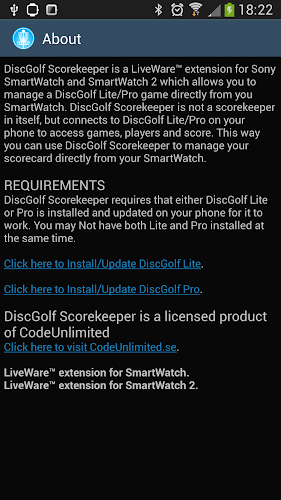 discgolf scorekeeper je rozšíření liveware™ pro chytré hodinky Sony a chytré hodinky 2, které vám umožňuje spravovat hru discgolf lite/pro přímo z vašich chytrých hodinek. discgolf scorekeeper není sám o sobě zapisovatelem skóre, ale připojuje se k discgolf lite/pro ve vašem telefonu, abyste získali přístup ke hrám, hráčům a skóre. tímto způsobem můžete použít discgolf scorekeeper ke správě své skórovací karty přímo z chytrých hodinek.požadavky