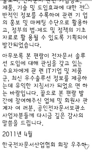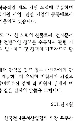 Korejská elektronická dokumenty a Asociace průmyslových asociace „E -Documents Solutions Class 2011“ je strategická úroveň světa, zatímco používání elektronických dokumentů v Koreji se v Koreji používá, zvyšuje produktivitu a efektivitu společností a veřejných sektorů a nakonec je uznáno jako prostředek k posílení národní konkurenceschopnosti a zlepšení kvality života lidí. Aplikace PDF -Type E -Book, která obsahuje celkové informace o elektronických dokumentech, produktech, technologiích a úvodních efektů jako nástroj propagace a marketingu pro relevantní společnosti, používaný jako základní údaje pro vládní zákony/systémy a politiky, a má zájem zavést řešení elektronických dokumentů.--------------------------------------------------------------------------------------------------------------------------------------------------------------------------------------------------------------------------------------------------------------------- -ination-by-way: 308