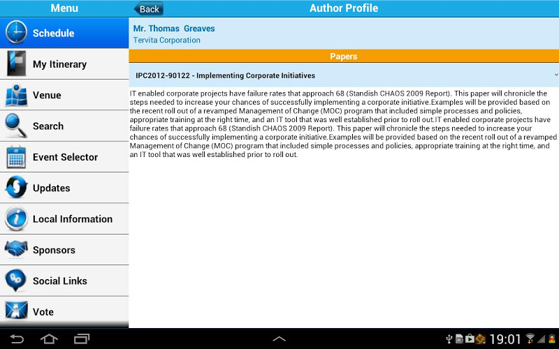 Plánovač itineráře ASME vám umožňuje naplánovat svůj denní rozvrh na místě pro konferenci ASME o vašem mobilním zařízení. Naplánujte si technické sezení, schůzky výborů, večeře událostí a další možnosti. Zobrazit...