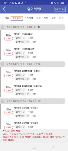 − 본 앱을 통해서는 ‘출석(동영상 수강)'만 가능하며, 그 외 평가항목(시험,과제,토론 등)은 PC를 통해서 참여하실 수 있습니다.