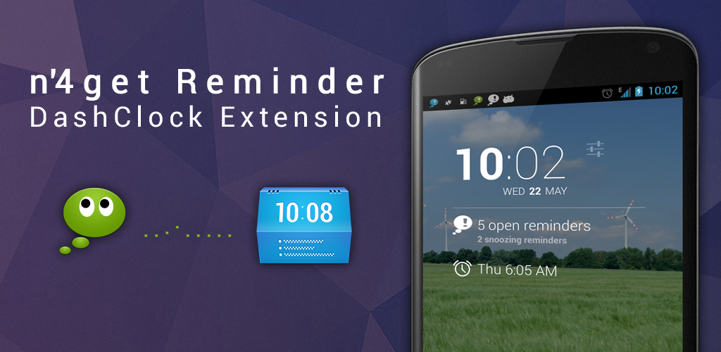 Das ist eine Erweiterung für DashClock Widget und n'4get Reminder. Sie dient als Verbindung zwischen dem weit verbreitenen Lockscreen Widget und der praktischen Erinnerungsapp.Mit dieser Erweiterung kann DashClock Widget Informationen über offene Erinnerungen und Erinnerungen im Snooze dirket auf dem Lockscreen anzeigen. Drückt man auf den Eintrag werden diese direkt in n'4get Reminder angezeigt.