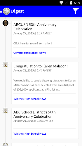 Mit der benutzerdefinierten Blackboard-App von ABC Unified School District haben Eltern und Schüler zu jeder Tages- und Nachtzeit eine zentrale Anlaufstelle für den Zugriff auf edline, abi und alle wichtigen Schulinformationen.Jetzt verfügen Eltern und Community-Mitglieder über einen zentralen Hub mit allen Tools, die sie benötigen, um über die neuesten Nachrichten und Benachrichtigungen von abcusd und seinen Schulen auf dem Laufenden zu bleiben, einschließlich: